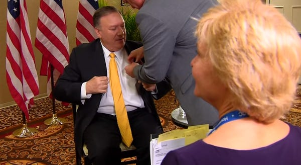 Secretary of State Mike Pompeo thought he was in town to talk about "religious freedom," which is a subject he VERY LIKES, because of how he's been assembling the worst American fundamentalists to be on his so-called "religious freedom" commission, which is just "Handmaid's Tale" shit packaged in vaguely more intellectual language. Amons decided to do journalism instead, and the man best known as a heat-seeking missile for Donald Trump's ass turned into a heat-seeking missile for the nearest exit.