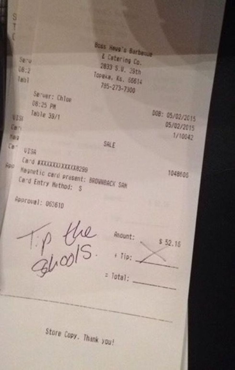 Brownback added a very generous 10% tip anyway, which proves that unlike Hillary Clinton, he does tip, just very cheaply. Dude clearly never worked at a restaurant. On the plus side, he didn't leave one of those bait-and-switch Bible Tracts instead of a tip, so we'll call it "coulda been worse."