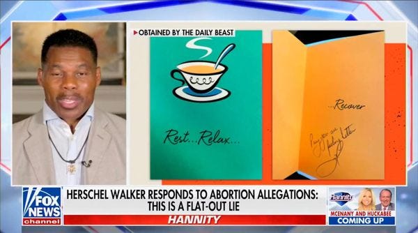 The woman said she came forward because Walker is so overtly anti-abortion and she'd had it with his hypocrisy. He has repeatedly compared abortion to murder, which means that we can say "Herschel Walker is an accomplice to murder, according to Herschel Walker." He's grossly dismissed exceptions to abortion bans for rape, incest, or the life of the mother as just “excuses.” However, in his own life, "faulty condom" is an appropriate justification.