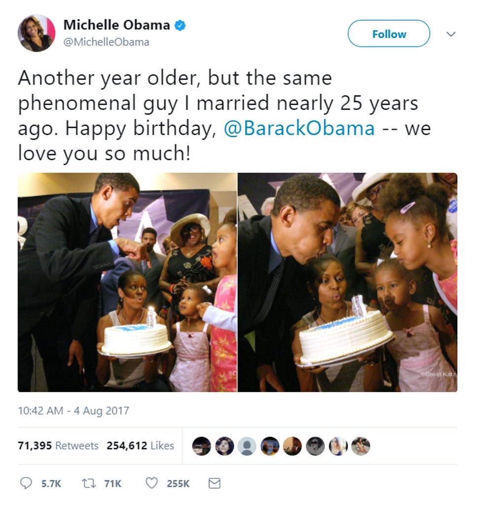 Here's Michelle Obama, the first lady of the people in the United States who love our country, saying OH HEY BIRTHDAY BAMZ on Twitter: