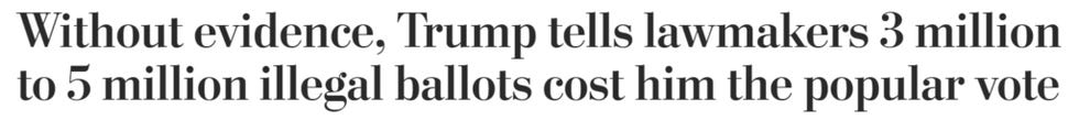 It is worth noting that Trump said this (again) at a reception for congressional leaders, which means he actually said the lie/falsehood/egotistical, fantastical word vomit right to the faces of Democratic leaders Chuck Schumer and Nancy Pelosi. As the Washington Post notes, he is now claiming that THREE TO FIVE MILLION illegal Mexican Spanishes did voter fraud, which denied him the popular vote win he believes he so richly deserves.