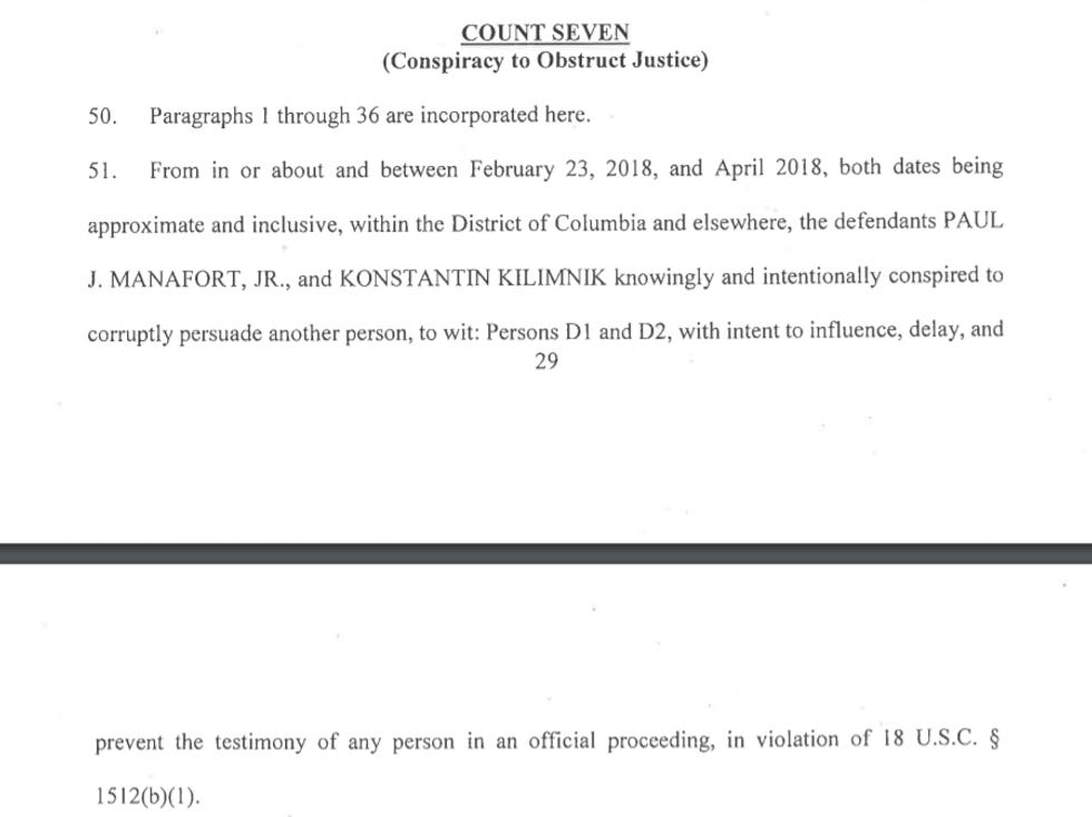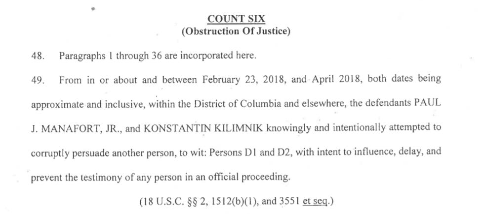 As we explained the other day, Persons D1 and D2 are former business partners of Manafort and Kilimnik in Europe, who are also described by NYT as "veteran journalists." These are the folks those dumb fuckers started Snapchatting like "Hey bro! Hey bro! Feel like lying to Robert Mueller today? And maybe later we can Netflix 'n' chill? Bro! Bro!" So there's a count for obstruction of justice.