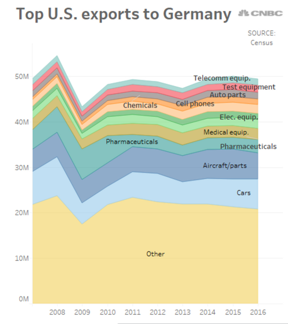 Also yes, we do have a trade deficit with Germany, but, well, the United States is huge and Germany has about a quarter of our population, so it stands to reason that we'd buy more shit from them than they do from us. And when you are the country that makes BMWs and Audis, it's probably pretty hard to interest the Germans in a fleet of our finest Dodge Grand Caravans, we are just saying. But the Germans do buy a lot of shit from us -- 'SPENSIVE shit: