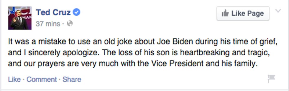 Those well-timed humdingers worked great in a crowd of Republicans, big surprise, but not so great with the internet. So after Cruz was shamed a million times for being unable to wait until the vice president had buried his son, to start up with those classic Biden digs, Cruz said he was real sorry 'bout that: