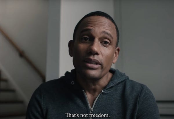 "That's not freedom," he says in a close-up shot. "At the core of so much of this is are too many politicians in office that don't really care about people."