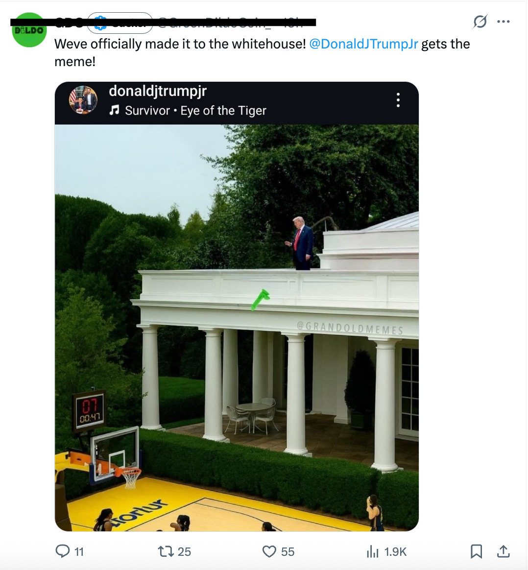 If you haven’t guessed by now, these folks are clearly pretty Trump-y, and were very excited to share an image shared by Donald Trump Jr. of Trump throwing a green dildo at WNBA players from the White House roof — not the first time the man has thrust a penis onto someone who didn’t want it.