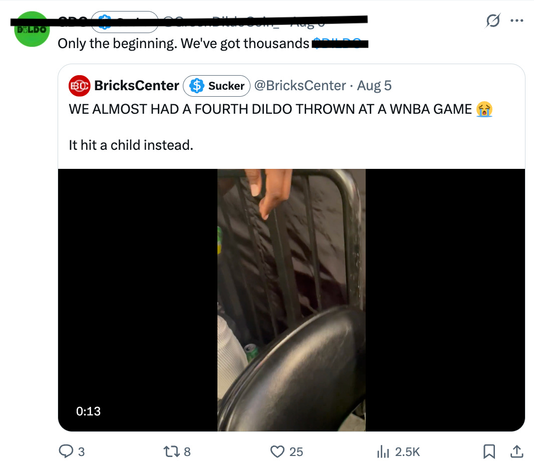 For the past couple weeks, green dildos (and one purple dildo) have been thrust upon the court at multiple WNBA games across the country, and the reason why is no longer a mystery. As it turns out, it was a bunch of douchebag cryptobros who were trying to promote their memecoin cryptocurrency, for some of the most annoying reasons ever cited for doing anything in the history of the world.