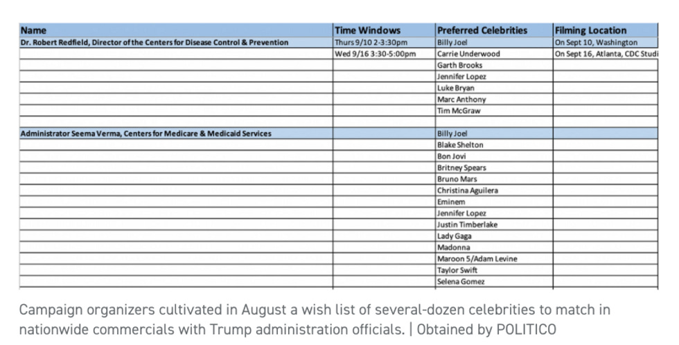 Which is way harsh! They weren't planning to use C-list celebrities. If they couldn't get Timberlake for Verma, they were willing to settle for Lady Gaga or Taylor Swift or even Eminem. And the celebrity matchmakers at HHS were hoping to set CDC Director Robert Redfield up on a hot date with Garth Brooks or Jennifer Lopez.