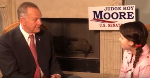 Finally, here's a video of a 12-year-old girl interviewing Roy Moore, put out by a pro-Trump PAC. We don't know if they were literally trolling themselves, or whether they just wanted to prove Roy Moore could be in the same room with a girl child without getting handsy.