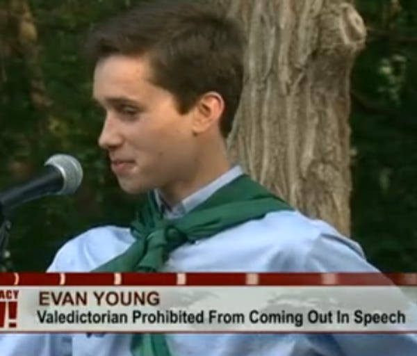 So here is a story that happened, about an asshole high school principal in Longmont, Colorado, who couldn't bear to let this year's class valedictorian -- that means "the best student in the class," FYI -- deliver his speech, because the kid wanted to use the speech to come out as gay. The kid's name is Evan Young, he's graduating with a 4.5 GPA, and he's headed to Rutgers on a scholarship. Sounds like a REAL BAD SEED, we're glad the principal was able to get him under control: