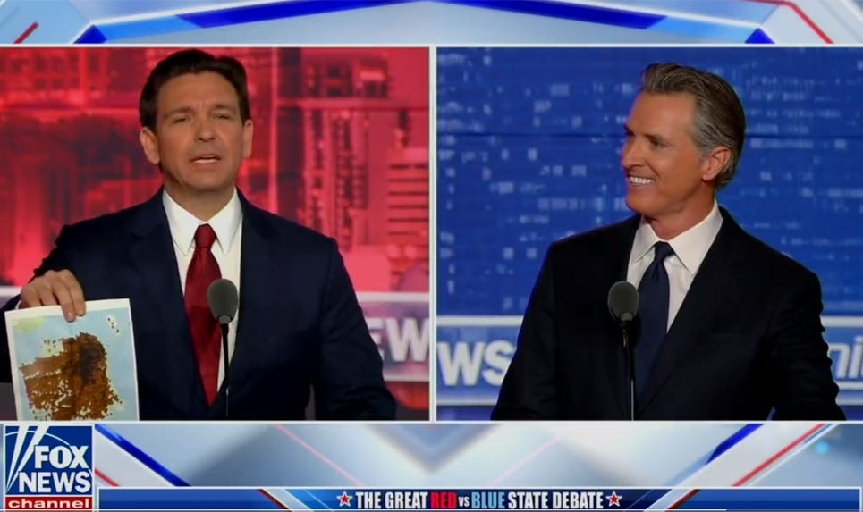 Here’s an example of the high-minded discussion: DeSantis said “San Francisco” a lot, signaling to Fox viewers that Newsom is pure evil and chaos incarnate.
