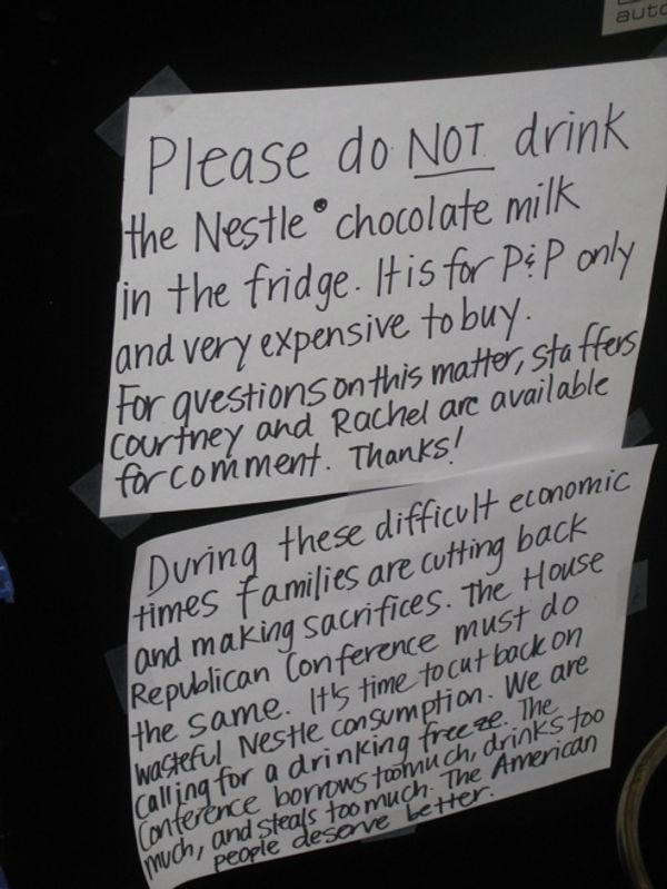 A Hill staffer sends us this comical image and writes: "This fridge is located outside of the House Republican Conference in Longworth House Building. They seem to be moving offices, and this is a note they have attached to their fridge." Be sure to read the very end, in which the Chocolate Milk Nazis note that the House Republican Conference "steals too much." But perhaps the American People do not give a shit if some Hill staffers are drinking too much stolen chocolate milk?