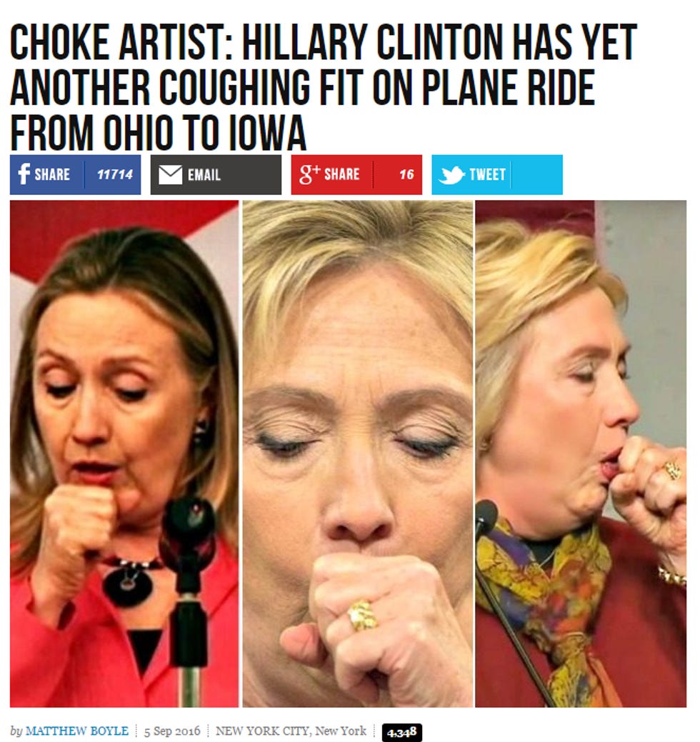 And Breitbart has several articles up today, which are all about how Hillary Clinton, Benghazi Email Demon, hacks up her lungs all the time, whenever she wants, like the all-powerful, rapidly dying ogre demon she is: