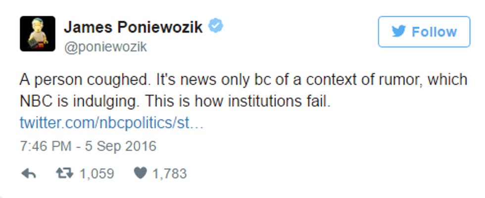 As far as pushback in the other direction, the sane direction, the one about PEOPLE COUGH SOMETIMES GET THE FUCK OVER IT, there is New York Times TV critic James Poniewozik, from the same New York Times that is the world's finest purveyor of Ginned-Up Hillary Clinton Scandal Porn. We see his point but wonder if he should, instead of tweeting meany words to NBC, hit REPLY ALL to everyone he works with, telling them to shut the ever-loving fuck up: