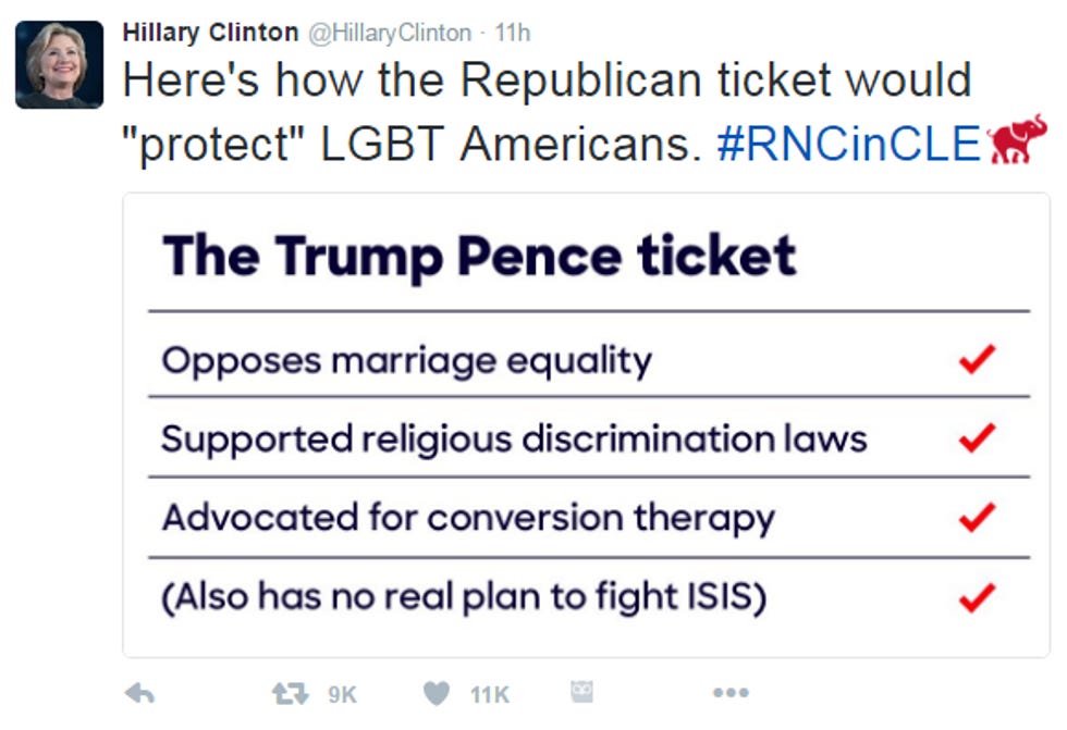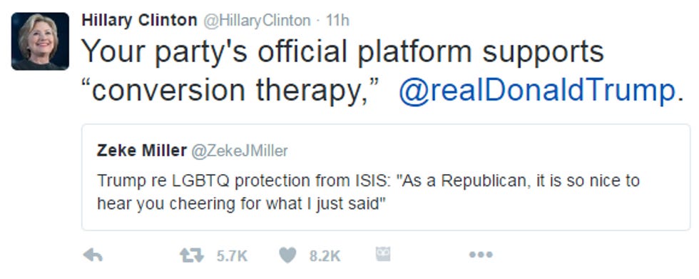 When Donald Trump got all heartfelt and shit about protecting "our LGBTQ Americans" from ISIS after the Orlando shootings, and then was very pleased that the Republicans in attendance didn't pull pitchforks out of their upon hearing "LGBT," Hillary reminded everybody of another thing: