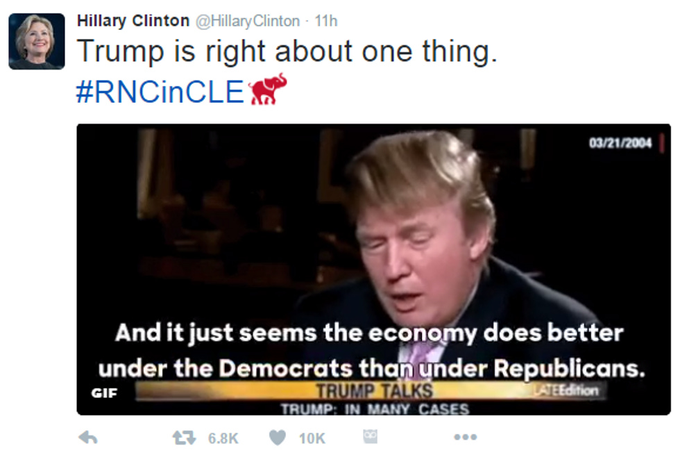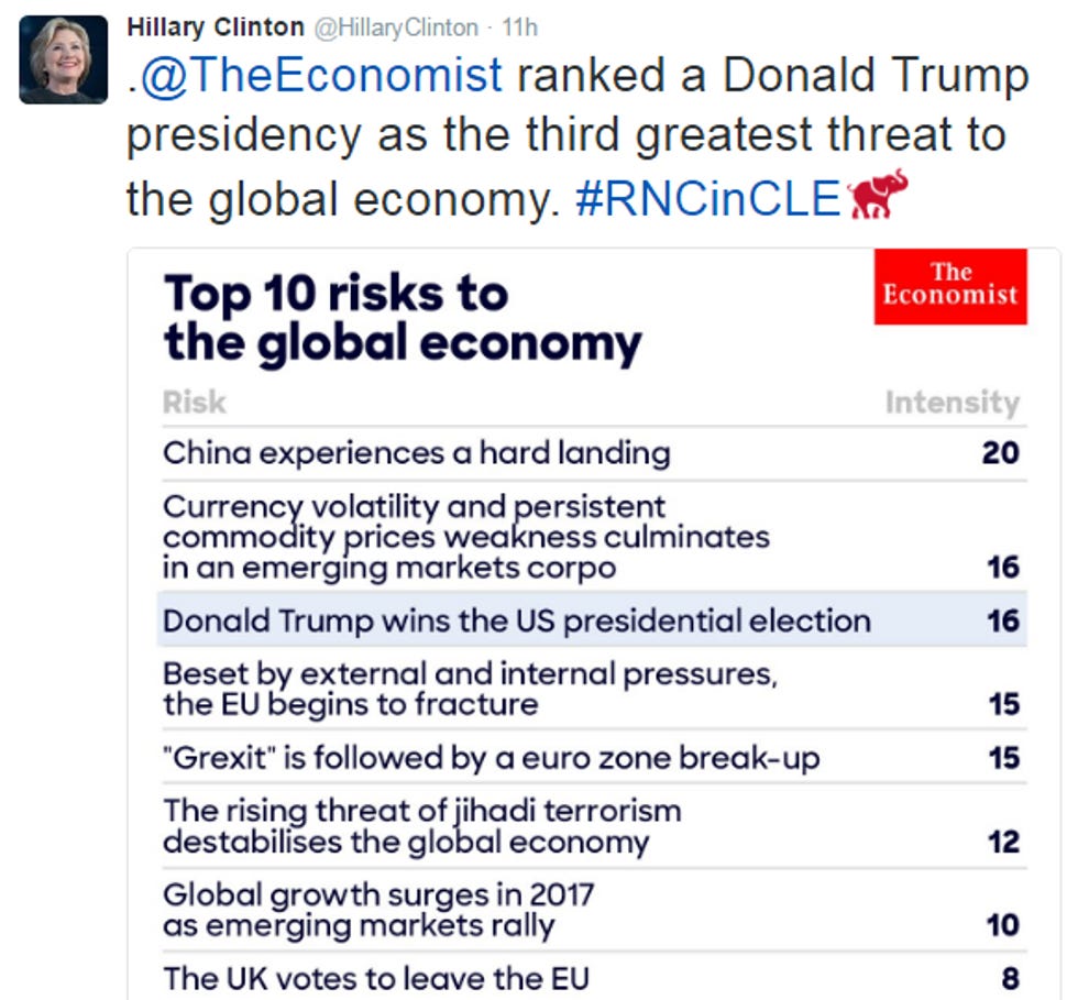Hillary tweeted pictures of herself murdering Osama bin Laden with her emails, and things about how Trump's tax plan would add $34 trillion to our debt. Then she decided, for no reason in particular (maybe all the stuff about how Trump will save America world with his tiny fingers), to remind everybody of that mean Economist piece that called a Trump presidency a VERY HIGH risk to the global economy: