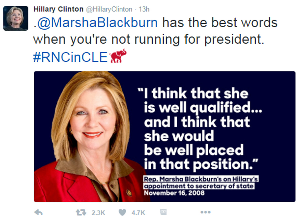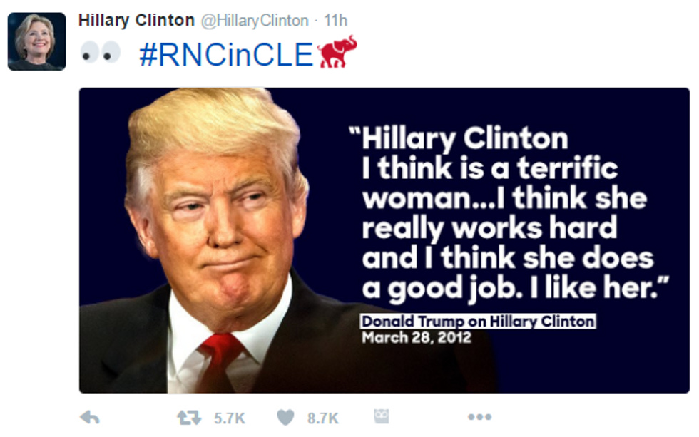 LOL it's funny because Trump (and lots of other people) have said really nice things about Hillary in the past few years. Just a few hours earlier, Hillary reminded us of another RNC speaker's erstwhile opinions of her: