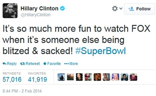Oh no she di'int! But wait! She dih'! Hillary Clinton tweetered out this amusing comment on the Sportsball Extravaganza Sunday, and while most people with normal reading comprehension read it as a comment on the coverage she's received on the Rupert Murdoch Rage Network, as compared to the humiliating pounding of the Denver sportsball fellows, it seems that the point was utterly lost on a couple of Fox anchors, either because they really are that dense or because it was in their best career interest to insist that they really love the lapels on their boss's new clothes.