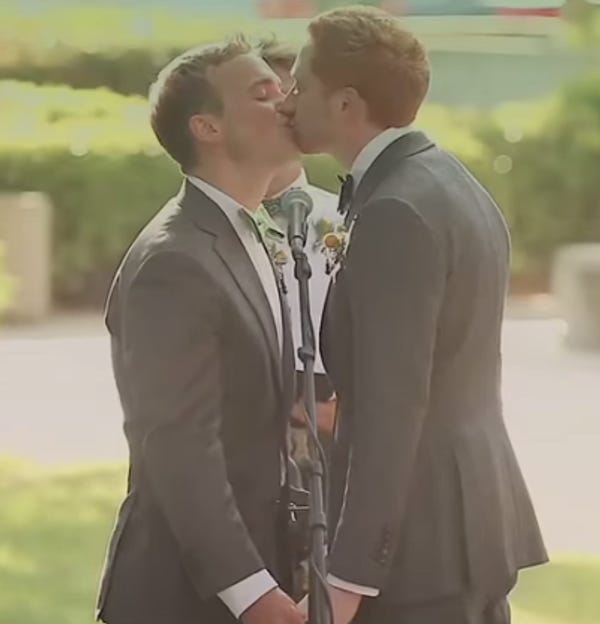 The video intersperses images of gay couples being gay to each other, including the couple who invited Hillz to their wedding! They're holding hands, they're proposing to each other, and they're even saying wedding vows. And THAT is the part that brought a tear to yr Wonkette's eye, the things this one guy says to his almost-husband. You'll see. SHUT UP, I'M NOT A PUSSY, you'll see when you are CRYING.