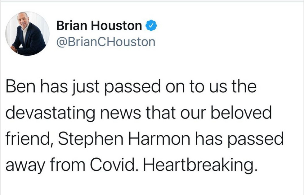 'Ben has just passed on to us the devastating news that our beloved friend, Stephen Harmon has passed away from Covid. Heartbreaking.