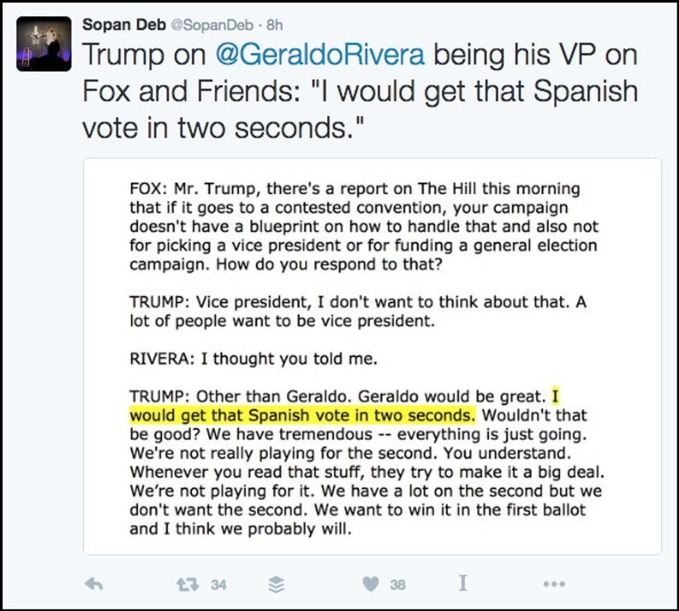 Ah yes, the all-critical Spanish vote, which is really what will tip the scales in Election 2016. Everyone else that is not faking being a racist demagogue nightmare hell machine is probably going for the Hispanic vote, or even the Latino vote, but Trump will outfox them all by focusing on the fifty thousand or so people that emigrated here from Catalonia or something.