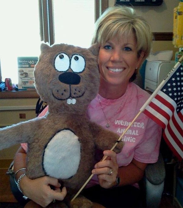 She's also written a wonderful "children's book" called What's Right, featuring lovable patriotic rodent "Stumpy TheBeaver,"Squirrel"* who we guess likes America and Jebus, which will be getting reviewed by Wonkette pretty soon, God help us. On her own Facebook page, Kinkead explains that the protest wasall about being a Christian Warrior: