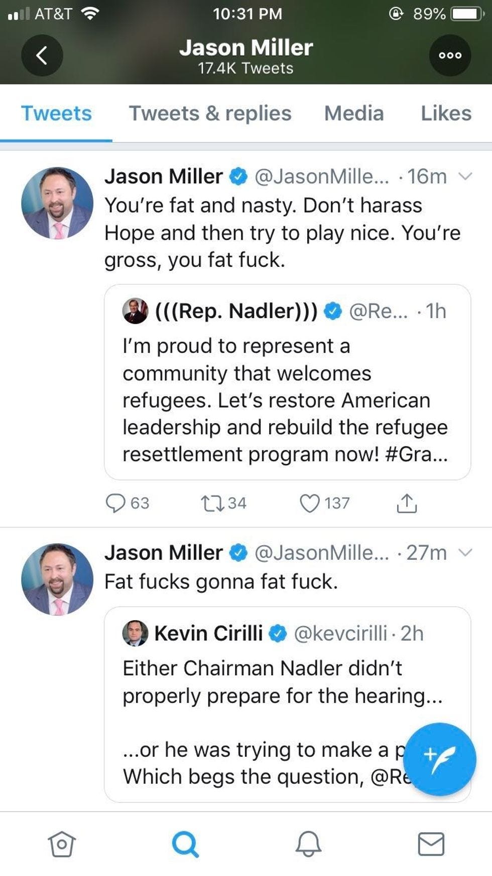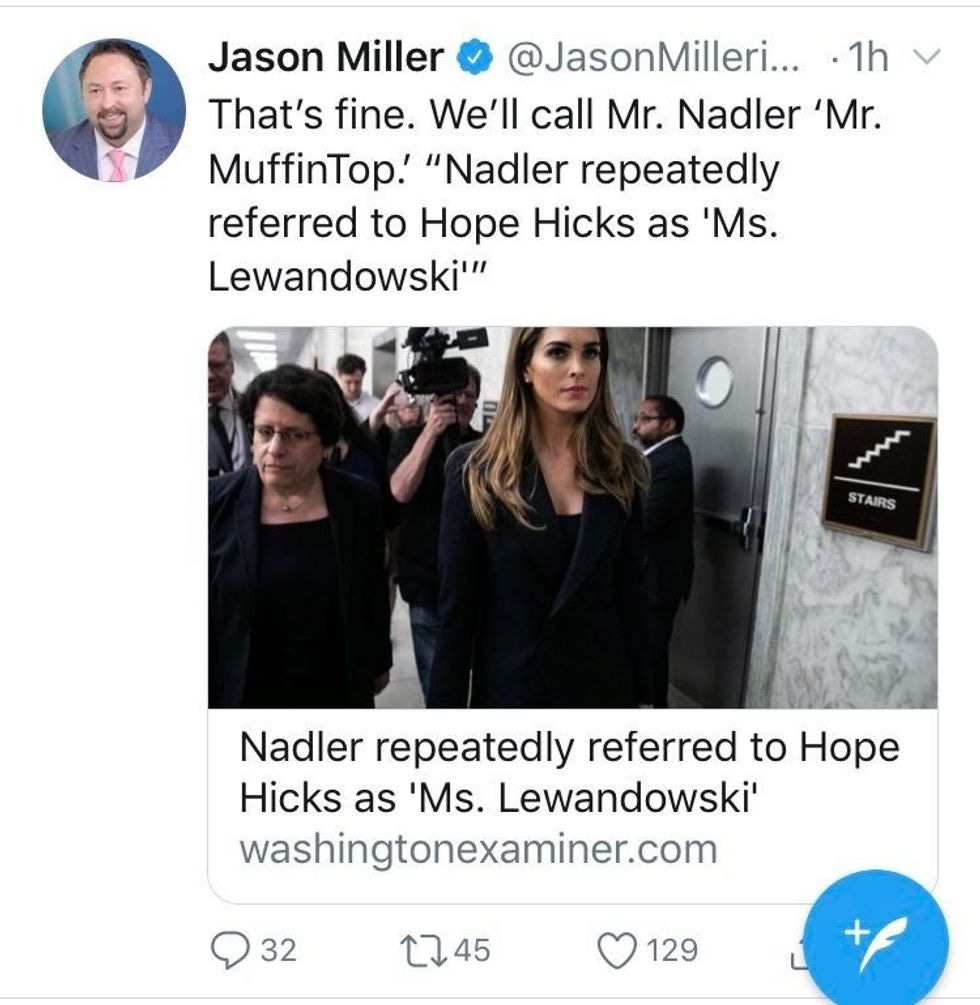 10: 29:Like we said, they are VERY UPSET. Here is former Trump adviser Jason Miller -- you remember him! The walking tub with what appears to be a talking butt-gina in the center of his face who had a SEXXX PREGNANT SCANDAL with another Trumper! -- saying very normal things on Twitter about Jerry Nadler accidentally calling Hope Hicks "Ms. Lewandowski."