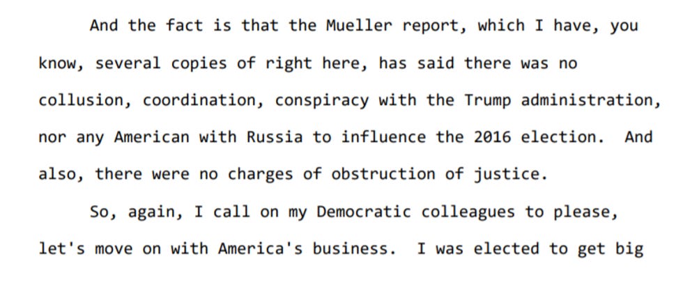 He notes that they haven't invoked executive privilege, because even those idiots know all this stuff is in the publicly released, redacted Mueller Report. Can't invoke executive privilege over stuff that's already out there!