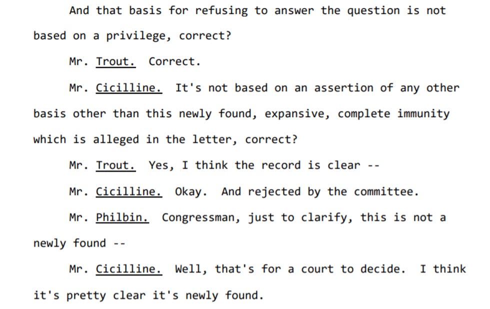 2: 34:Page 114. Ted Deutch just saying "huh weird, you guys didn't make up ABSOLUTE IMMUNITY and try to invoke that with Robert Mueller. Funny how you made it up JUST NOW." (Not his exact words.)