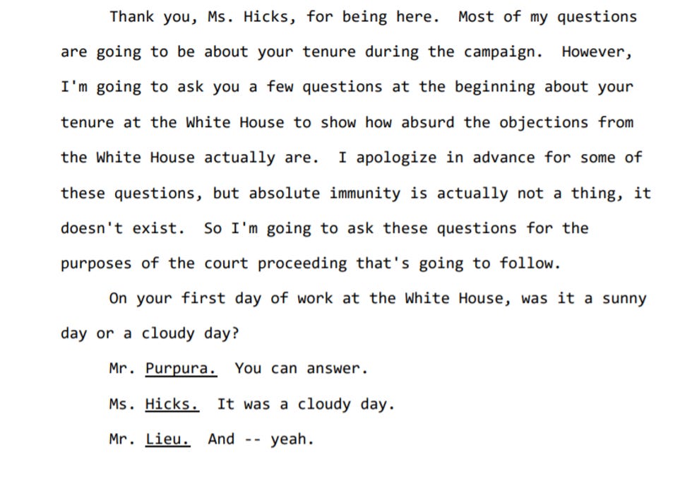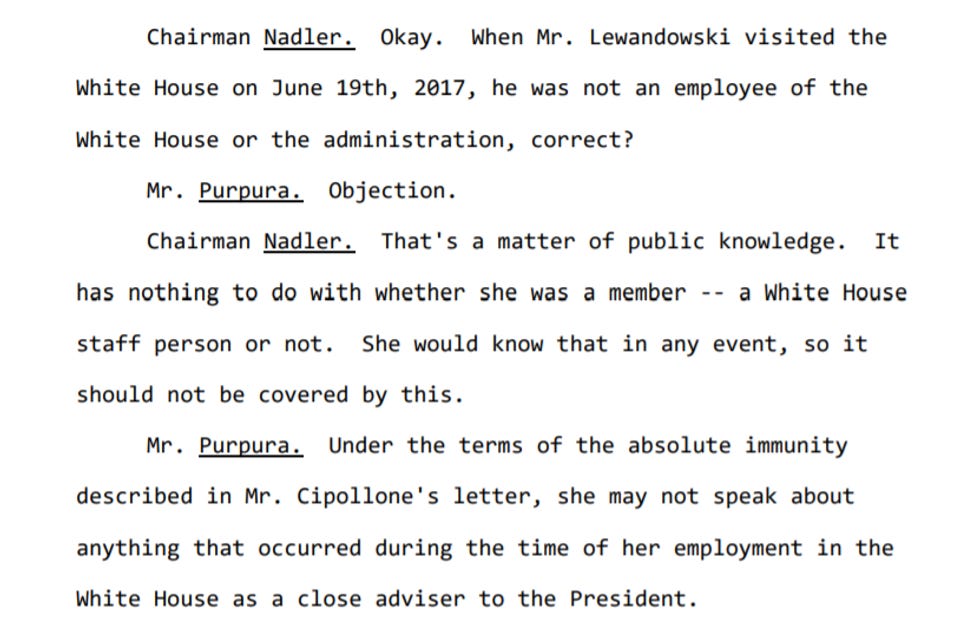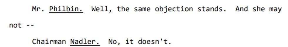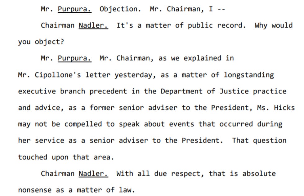 So Nadler began by asking Hicks where her desk was in the White House (p. 15), at which point I OBJECT, YOUR HONOR! She cannot answer that. The attorneys tried to act like the "absolute immunity" for which they were arguing had some sort of legal basis, but Nadler was like LOL fuck off, saying, "I'm not going to debate it. It's nonsense." He added that they'll argue all that out when he beats the shit out of them in court.