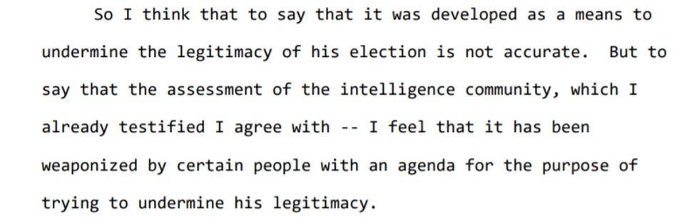 However, despite her refusal to answer all those questions, she definitely answered some stuff! Like, for instance, she said she thinks Trump was pretty serious recently when he announced his intention to commit election crimes in 2020 by taking dirt from foreign adversaries. She also dropped some VERY CURIOUS knowledge about the pee tape! Aren't you excited that the pee tape simply will not go away? Because it's probably real?