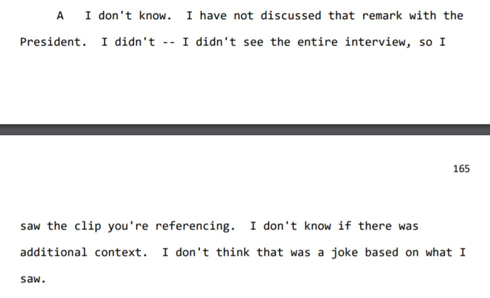 And so they would go. Nadler was hellbent on making sure the White House lawyers asserted their BS "absolute immunity" to literally every question asked, that they re-asserted that no, they were not asserting executive privilege. He also made clear with Hicks's personal counsel each time that his client was not asserting any other sort of laughable claim of legal immunity. And they'd move to the next one!
