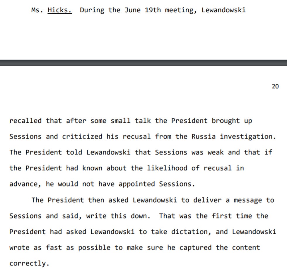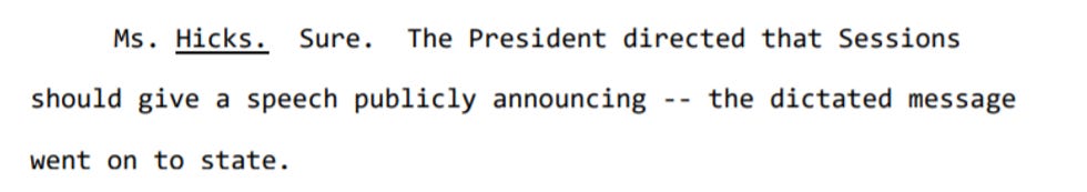 11: 34:P. 26. Hicks forgot to read the part of the passage above where it says "THE PRESIDENT DIRECTED" Jeff Sessions to give a speech saying all those lying, justice-obstructing bullshit things about Trump. She was like OOPS, so she read it aloud for the whole class.