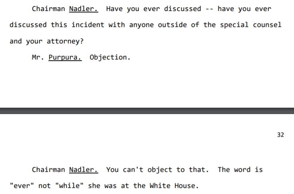 10: 46:On page 19, Nadler tries a new tactic. Instead of asking Hope Hicks questions about what happened in June of 2017 with Corey Lewandowski, how's about he just ask her to read what the Mueller Report says about it? GONNA SAY "ABSOLUTE IMMUNITY" to that one?