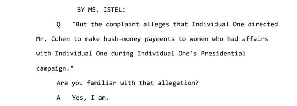 3: 55:Page 179, majority counsel reads from Michael Cohen's criminal information. Ms. Hicks, are you aware of THIS CRIME your boss committed? This particular time he was named in a federal guilty plea as a CRIMINAL? That's where he got the nickname "Individual-1"? Hicks says yes she was aware.