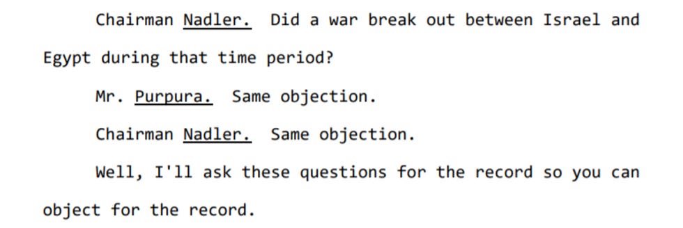 10: 59:Page 22. ANYTHING? Hope Hicks cannot talk about ANYTHING that happened while she worked at the White House? Hey, quick question: "Did a war break out between Israel and Egypt during that time period?" To which Purpura replied, "Same objection." For real.