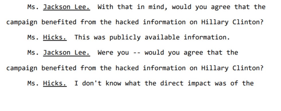 12: 11:On page 44, Rep. Sheila Jackson-Lee begins to question Hicks about that time in the campaign when WikiLeaks started dropping stolen Russian dirt, and the Trump campaign capitalized on it. And here, Hicks starts nitpicking, saying the campaign didn't have a RUSSIAN strategy, but just a strategy on how to use "publicly available information." (Which was public because Russia stole it and laundered it through WikiLeaks.)