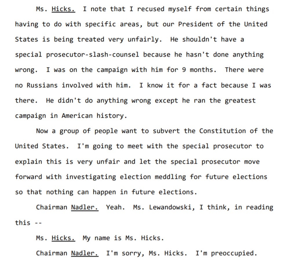 You'll notice at the end that Nadler accidentally calls Hicks "Ms. Lewandowski." Wingnuts and other Trump-breathers are VERY upset about this.