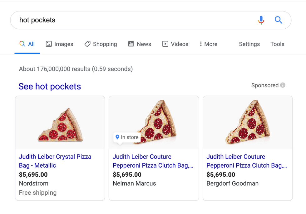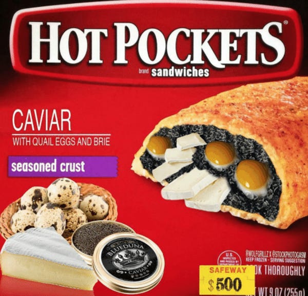 Just in case you weren't fully in eat the rich mode after this, may I please draw your attention to what came up when I Googled "hot pockets" today for this post. It is a $5,695 clutch bag shaped like a piece of pizza.