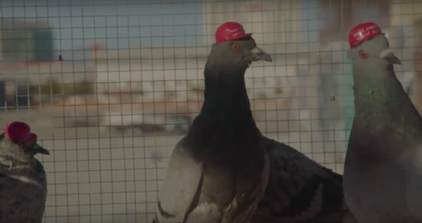 These jerks were proud of their efforts and filmed a video of the pigeons who'd done nothing to deserve this. Not all of the pigeons are disfigured with MAGA hats. At least one had on a Donald Trump toupee.