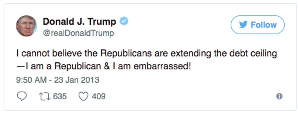Treasury Secretary Steven Mnuchin will not be presiding over another downgrade in the US credit rating, thankyouverymuch . The Goldman Sachs Globalists at the White House never believed any of that shit about the US economy being like a household budget, and they don't give a damn about increasing the national debt. Since the President and Congress are now on the same team, they'd like a vote to raise the debt ceiling without being shaken down by their own party. Per WaPo ,