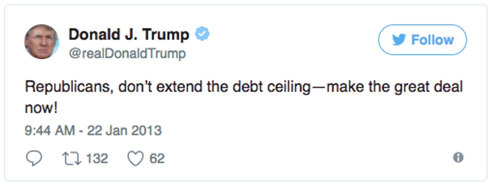 Mnuchin doesn't have many friends in Washington, so he's relying on Donald Trump to lean on the loons and get them to fall in line on the debt ceiling. But President A.D.D. couldn't even focus on the Obamacare repeal, and he actually "cared" about that, sort of, in his way. Are we going to be plunged into a debt crisis because someone pulls a firetruck up to the White House and tells Poppy to jump in?