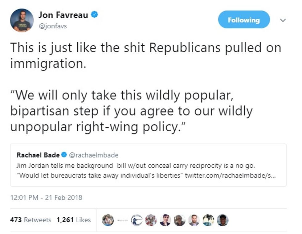 Apparently the due process built into the system already is just taking liberty away all the time, so states should be forced to honor the weakest concealed carry permits to make up for it. Jordan said he had a Solemn Pledge from House leadership that CCR would be tacked on to any new gun regulations, forever, until it passed.