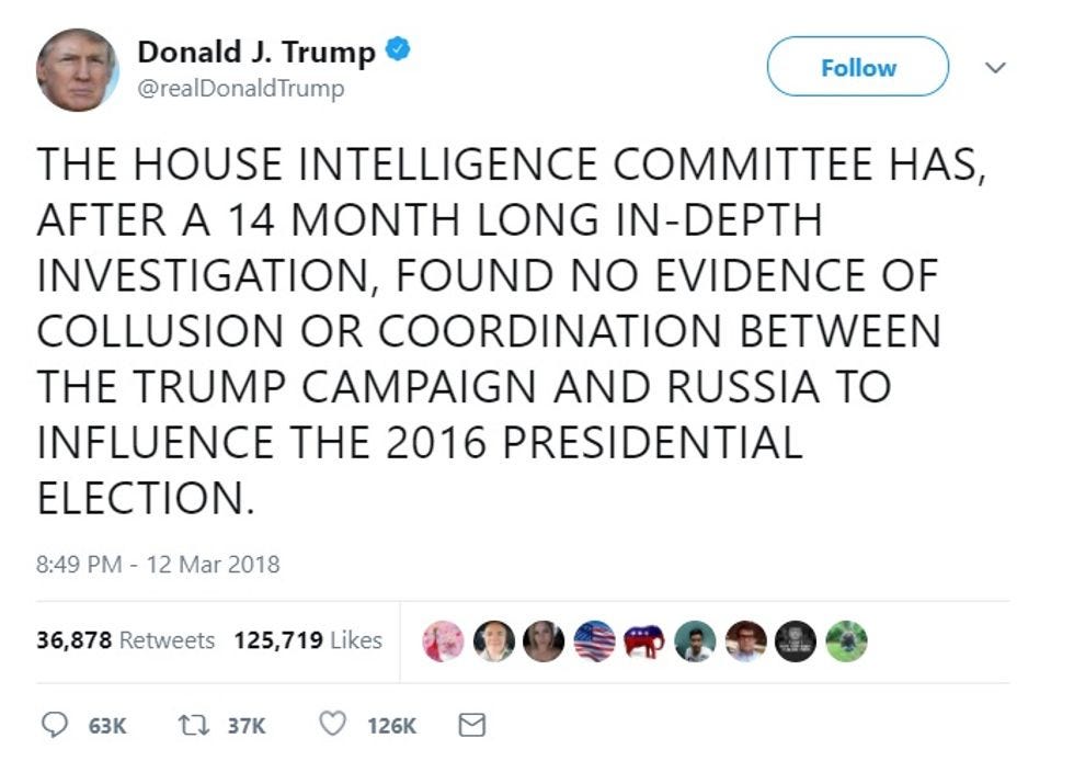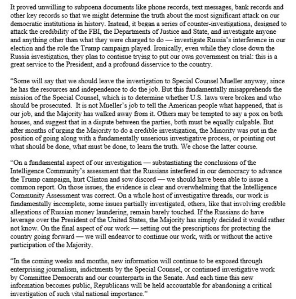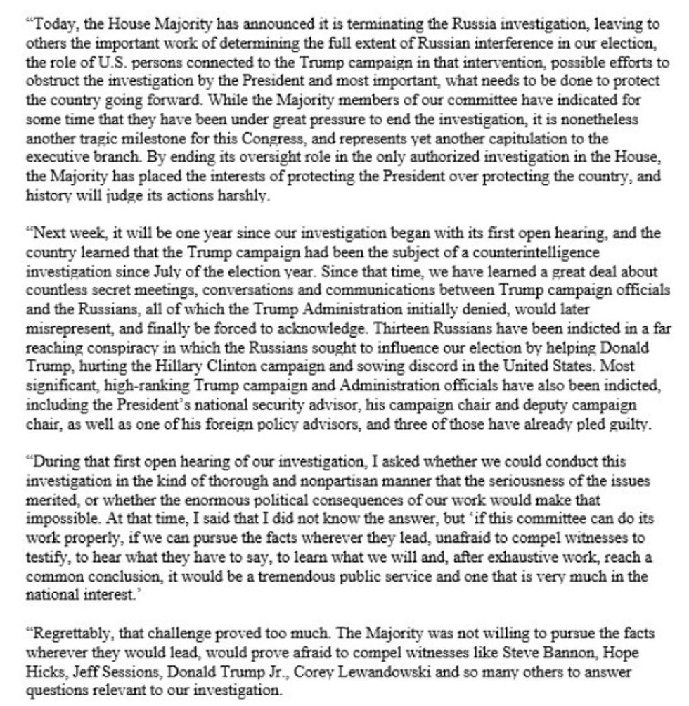 Next week, it will be one year since our investigation began with its first open hearing, and the country learned that the Trump campaign had been the subject of a counterintelligence investigation since July of the election year. Since that time, we have learned a great deal about countless secret meetings, conversations and communications between Trump campaign officials and the Russians, all of which the Trump administration initially denied, would later misrepresent, and finally be forced to acknowledge. Thirteen Russians have been indicted in a far-reaching conspiracy in which the Russians sought to influence our election by helping Donald Trump, by hurting the Hillary Clinton campaign and sowing discord in the United States. Most significant, high-ranking Trump campaign and Administration officials have also been indicted, including the president's national security advisor, his campaign chair and deputy campaign chair, as well as one of his foreign policy advisors, and three of those have already pled guilty. [...]