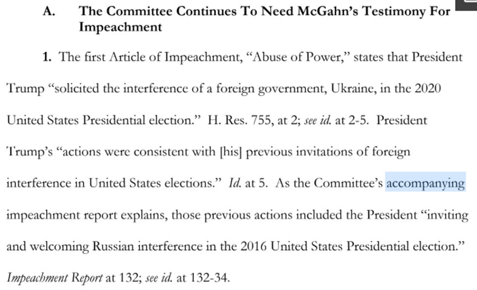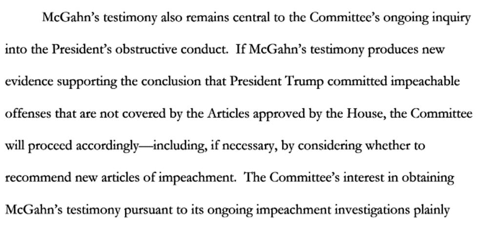 The House notes that, while McGahn wasn't present for the Ukraine-specific scandal for which Trump has been impeached -- and for which he will go on trial in the Senate once Nancy Pelosi has decided that Mitch McConnell is mature enough to assume responsibility for something so grown-up -- McGahn witnessed Trump crimes, both of the "abuse of power" kind (impeachment article #1) and the "obstruction of Congress" kind ( impeachment article #2). He was there for the firing of James Comey, and Trump tried to order him to fire Robert Mueller, then tried to get him to lie about it when the press found out. And so much more!