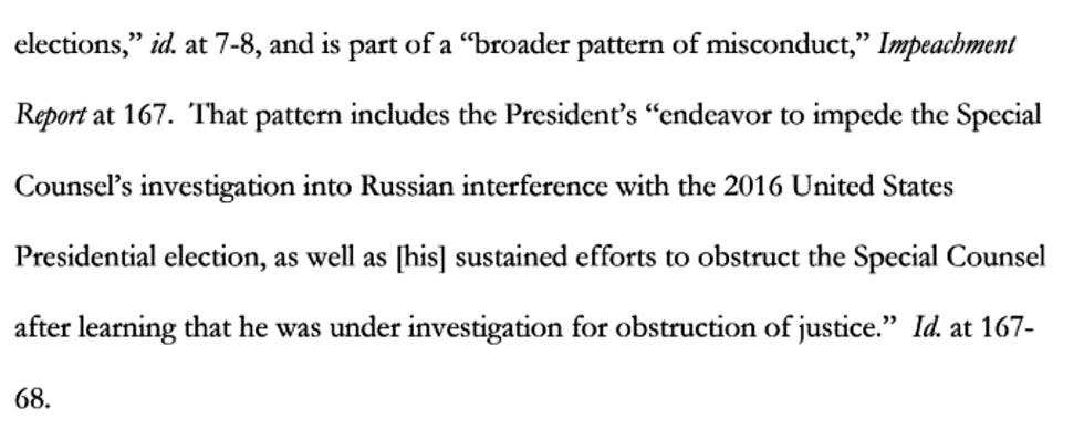 Anyway, the House goes on to note that the timing of impeachment was fast because Trump's crimes are literally right now in progress and could affect the 2020 election, so please don't think the House is like ALL FINISHED! It isn't.
