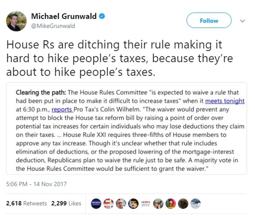 In order to set the stage for a whopping four hours of debate today on the House version of the Big-Ass Tax Cuts for Corporations and the Rich Act of 2017, the House Rules Committee met last night to waive a 1995 Republican-passed rule requiring a 3/5 majority on any bill that raises taxes. Politico senior writer Michael Grunwald shared the scoop (the full article is only available to Politico Pro subscribers, so thanks for letting us behind your own paywall, Mr. Grunwald!):