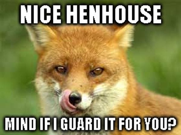 Everybody has said it, but this is the fox guarding the henhouse, or if you don't like trite metaphors like that, this is Donald Trump guarding the pussy or Chris Christie guarding the snacks or Vladimir Putin policing the internet hacking or Sarah Palin being appointed to put a stop to all this grifting.