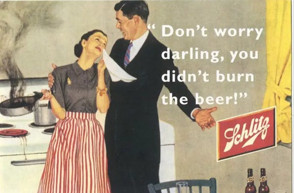 I LOVE those old sexist ads. I bought a pair of end tables from the thrift store and repainted them and gave htem new handles on the drawer, and I bought special cut glass tops for the tops (It wasn't that bad, each piece of glass was like $15), but I printed out all the most sexist old ads I could find and put them under one of the glass tops. It was a total hit at parties since they were all real and some of them are SO SEXIST, it's just hilarious.