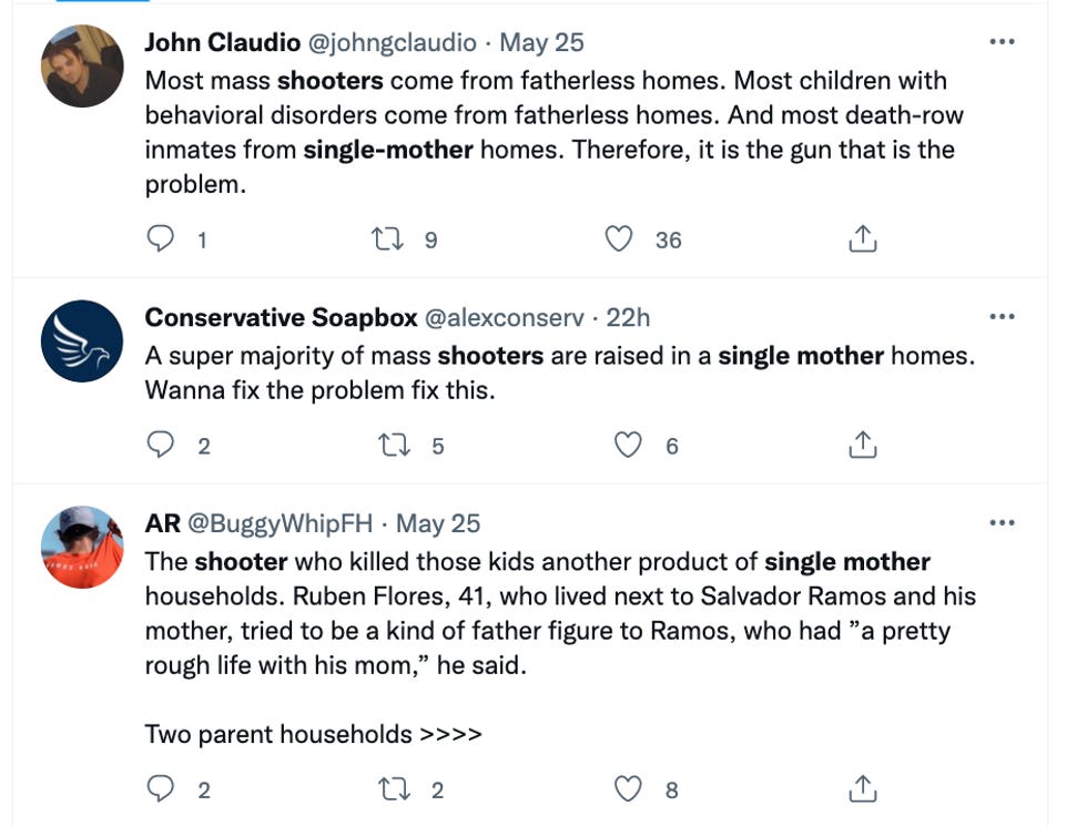 While at least this time they're not claiming, Jordan Peterson-style, that these shootings could have been prevented by "enforcing" monogamy in order to make it easier for violent psychopaths to score a girlfriend, there's no shortage of Twitter threads about how these tragedies happen because women don't know their place anymore, because feminists murdered masculinity and won't let any boys be "courageous" anymore, or because single mothers ... exist.